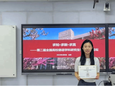 参加本次学术创新论坛的经历让我收获颇丰。特别是备赛阶段,在导师李媛教授的指导下,我尝试在学术展示的过程中跳出论文的固定框架,以问题导向的方式重构讲稿,层层递进。感谢北京外国语大学组委会搭建的高水平交流平台,它让我更加深刻地认识到,科研并不是闭门造车,而是要在交流碰撞中迭代,在实践反馈中成长。未来我将以本次大赛为起点,以更加严谨的态度深耕这一领域,把“守正创新”四字真正融入学术实践的每一个细节。祝愿全国高校德语学科研究生学术创新论坛越办越好!