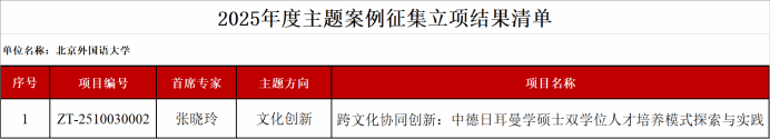 院长张晓玲教授作为首席专家申报的案例《跨文化协同创新:中德日耳曼学硕士双学位人才培养模式探索与实践》,成功入选2025年度“文化创新”主题案例。