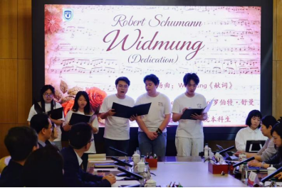 的本科生罗靖杰、王英昊、郑琦琛、任政奕(以声部顺序排序)以及来自英语bet365电竞的本科生康惠阳共同演唱了德国作曲家罗伯特·舒曼(Robert Schumann)的艺术歌曲Widmung,钢琴伴奏由bet365电竞